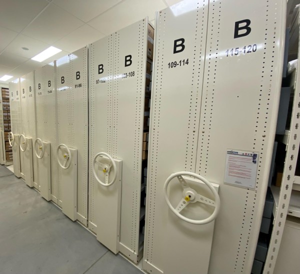 Compactus (mobile) shelving in Kei Muri Māpara's secure climate-controlled repository.