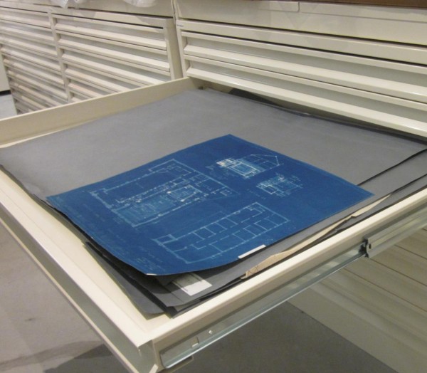 An open plan drawer in the repository with a blue print from Kei Muri Māpara's collection.